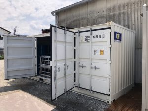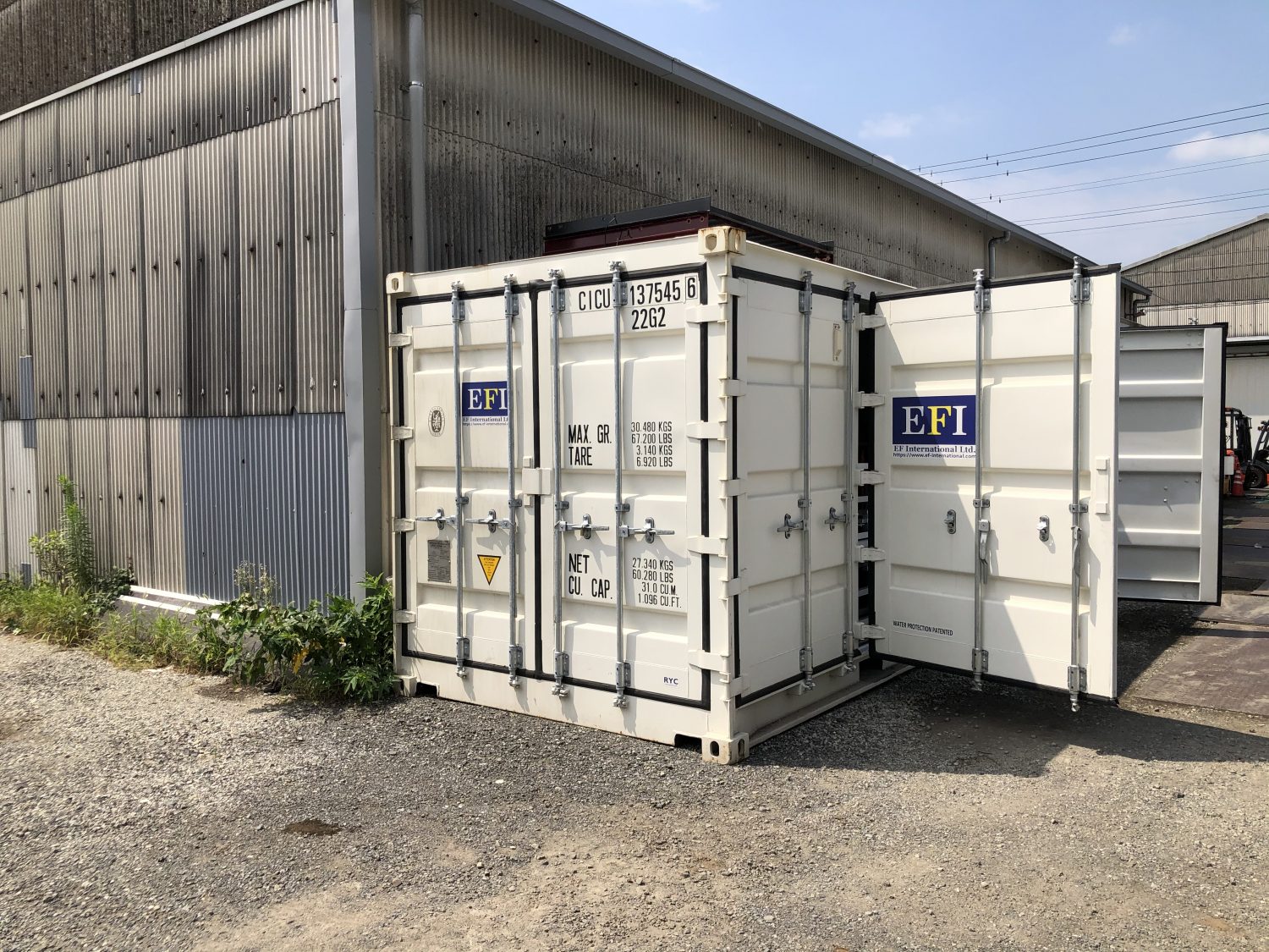 今回のサイドオープンコンテナは倉庫として購入・使用中。通常ドライコンテナはリアドア1面だけが開くので、奥に荷物を置くと収納・取り出しが大変ですが、このサイドオープンコンテナは横手全面を開くことが出来るため、長尺物含め、横から出し入れできるので便利です。