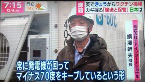 その情報を各方面に伝えたところ、TBSテレビが興味を持ち、Super Freezerの実物を取材したいとの申し出を受けた。運が良いことに、弊社が販売したSuper Freezerを琉球海運さんが、東京/沖縄航路で運用されておられるので、TBSテレビ取材の件をお願いすると快諾していただいた。それで12月8日朝7時放映の“あさチャン!”で、英国でのコロナワクチン接種開始のニュースの中で、コロナワクチンは超低温での冷凍輸送・保管を必要とするが、それに合致するThermo King社のSuper Freezerがあるので、日本の視聴者に安心してくださいと言うメッセイジを込められた。それまではどの番組を見てもマイナス70℃の超低温の冷凍庫は限りが有り、運搬・保存は難しいという内容で、ワクチンが日本に来ても果たして問題なく国民に接種することができるのかと言う論調が多かった。