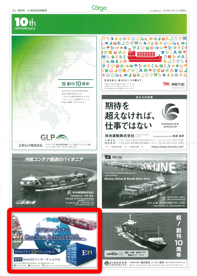 EFインターナショナルの広告を日刊Cargo(海事プレス社)10周年記念特集号に掲載いたしました。