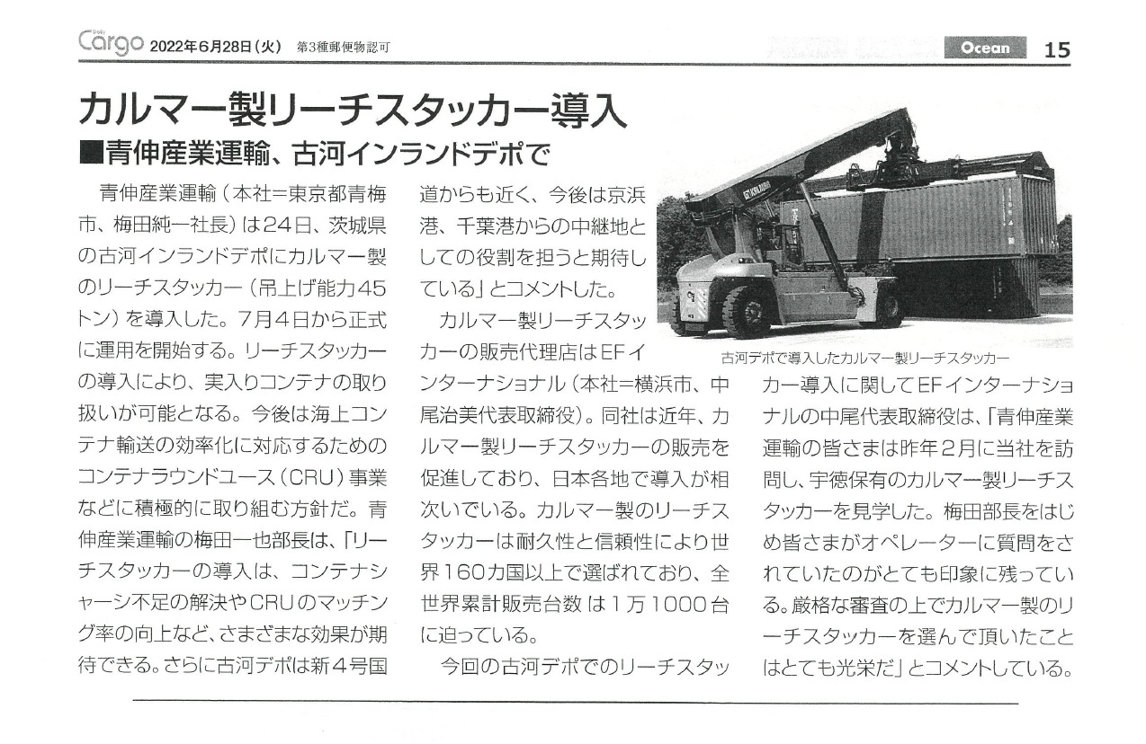 「Daily Cargo」6月28日号に弊社が販売、納入したカルマー製リーチスタッカーについての記事が掲載されました。