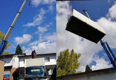 通常20ftコンテナの設置はユニック車(小型クレーンを持つトラック)が使われることが多いですが、