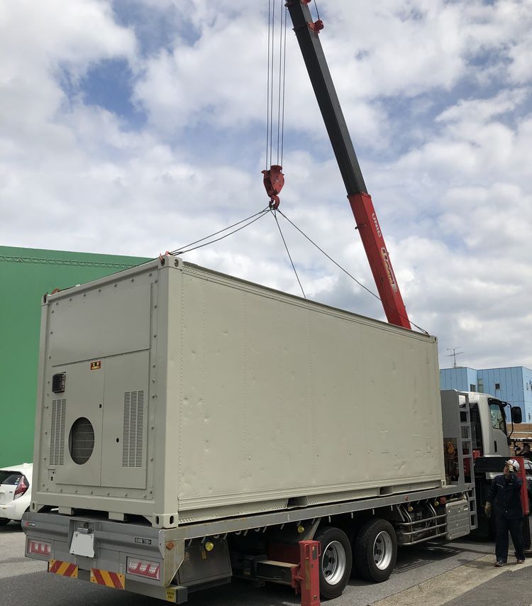 今回のコンテナのユニットは通常の海上コンテナ用から汎用機静音タイプに入れかえており、海上コンテナユニットに比べると電気代が安くなる、音が静かであるというメリットがあります