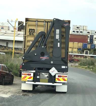 日本ではクレーンやユニックでコンテナ上部の四隅のツイストロックに引っ掛けて積み下ろすのだが、こちらは下部のツイストロックを使うよう。世界には色々な荷役機器があるものである。