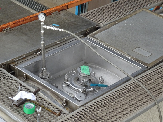 気密検査。2.5年毎に行います。1barの空気圧をかけます。水分と反応して危険な場合は