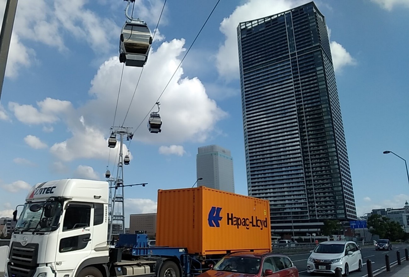 桜木町の新しい風景の下、本町通り、通称「コンテナ街道」にはおなじみの海上コンテナが行き交っていました。