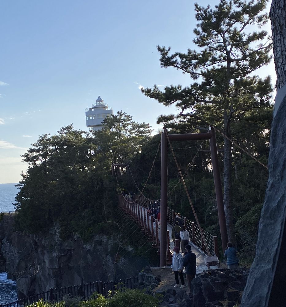 城ヶ崎海岸・脇吊橋から門脇崎灯台を見て、数十年前の感想とは違い吊橋が意外と短く感じたが高所恐怖症があるので怖いのは同じ。