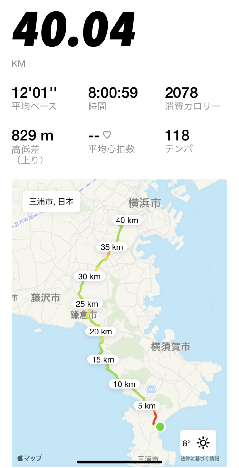 三浦海岸から弘明寺までの総歩行距離はざっと40キロになります。