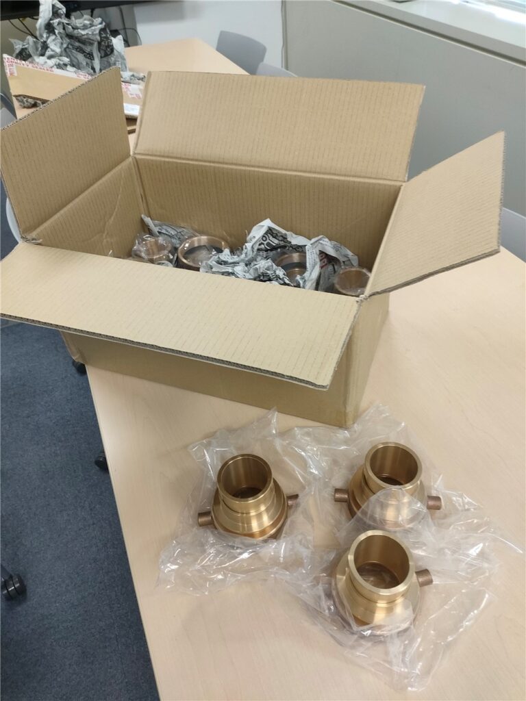 そんな中、久々にまとまった注文が決まってほっと一息。夏休みは束の間くつろげそうです。注文に含まれる継手を製作。現品が到着したのでさっそく検品しています。継手は3”BSPのボトムディスチャージとホースをつなげます。