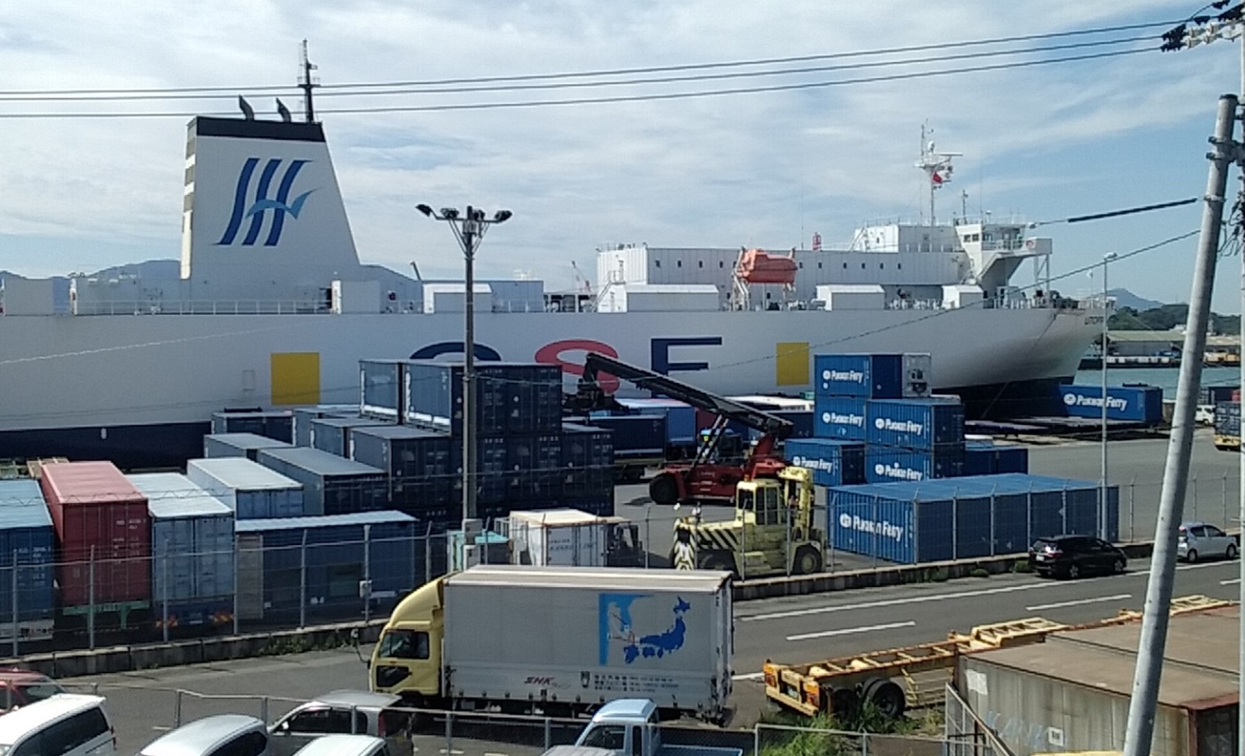 関光汽船様は、下関と韓国釜山を結ぶ「関釜フェリー、週7便寄港」と、下関と中国太倉を結ぶ「蘇州下関フェリー、週2便寄港」の荷役作業に従事されています。毎週9隻の国際フェリー・RORO船の貨物の積卸、及び貨物の搬出入トレーラーの積卸に、カルマー社のリーチスタッカーが本日も活躍していました。